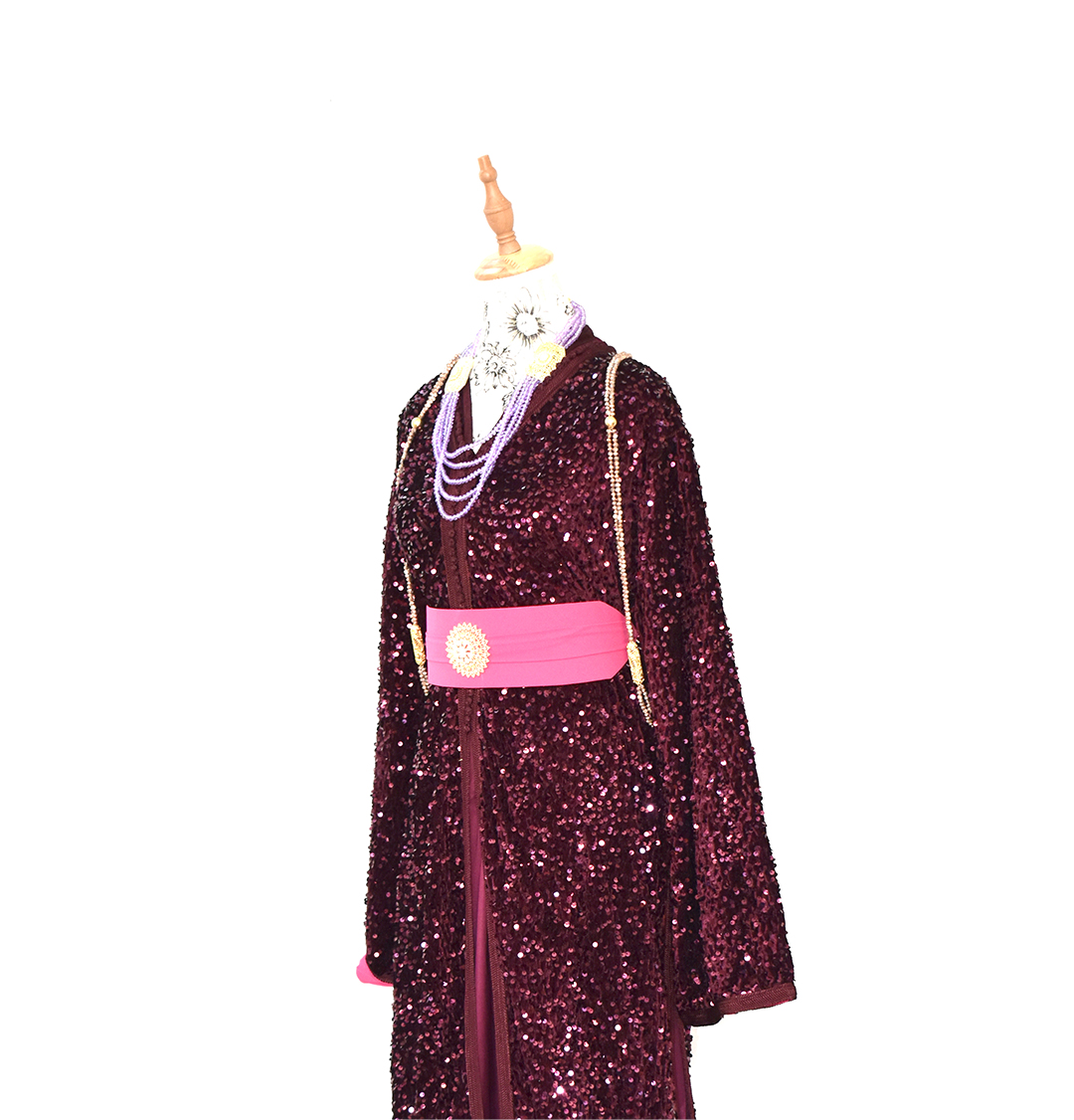 Takchita marocaine bordeaux à sequins avec ceinture rose